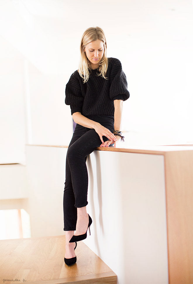 Dress and shoes, Céline. Wool sweater, Isabel Marant. High waisted jeans, Acne Needle. Button down, J.Crew. Belt, Ralph Lauren vintage. Bracelets, Alyssa Norton black silk thread and gold chain wrapped and a Tiffany’s gold bangle worn with a vintage Cartier Tank.